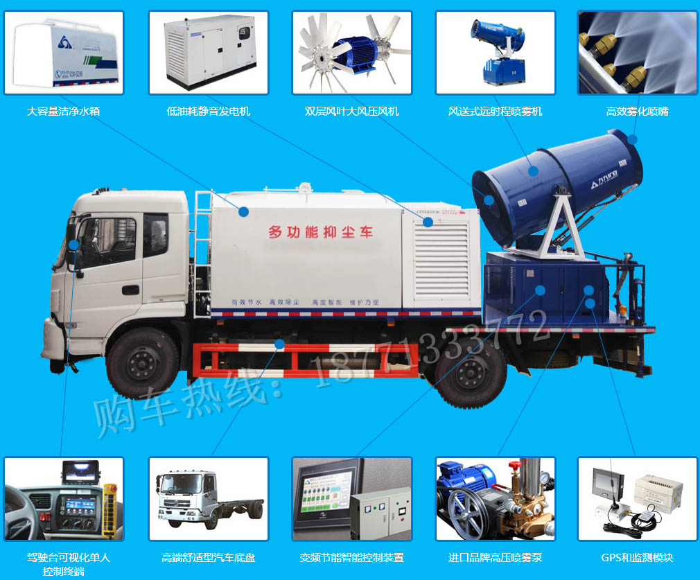 多功能抑塵車是在原裝底盤基礎上改裝,安裝電動水泵、管道、流量控制系統、霧炮、電控箱、遙控裝置、液壓升降系統、噴臂和噴嘴等構成一個完整的一種除塵固化劑的裝置。廣泛用于其它散裝物料運輸過程防揚塵污染以及渣料場、儲煤場、建筑工地、汽車運煤揚塵、固沙、鋼鐵建材、水泥、企業各種露天料場生態護坡等方面。